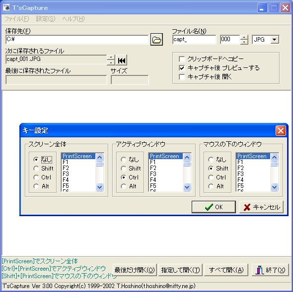 [PrintScreen]キーなどによってキャプチャしたイメージを、自動的に指定のファイル名に連番を付けて保存するキャプチャツールです。